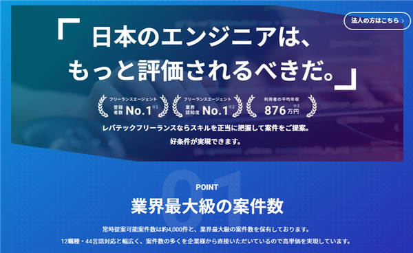 レバテックフリーランスは、ベンチャー企業から大企業まで案件を幅広く取り扱い、市場にあまり出回っていない非公開案件を多数保有している、国内最大手のフリーランスエージェントです。