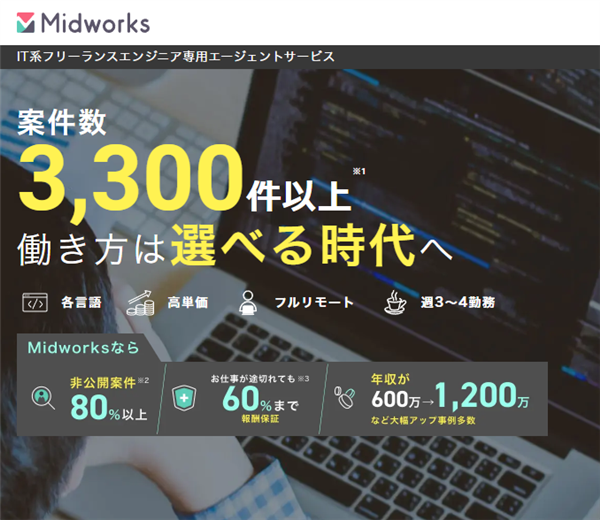 Midworksは、正社員並みの手厚い福利厚生が特徴で、フリーランス特有の急なリスクを事前に防ぐことが可能なエージェントサービスです。